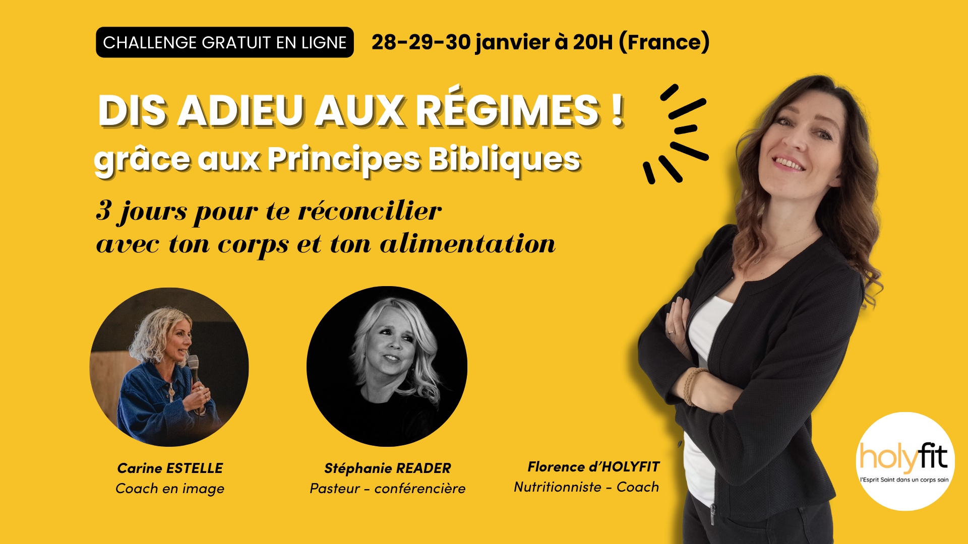 évènement: CHALLENGE " Dis adieu aux régimes grâce aux Principes Bibliques" Adresse : https://coaching.holyfit.fr/challenge-inscription sur zoom en ligne France Date : 28 au 30 janvier 2026 Heure : 20h -21h30 (heure de Paris) Type : Soirée Tarifs Offert Contact : Florence d'HOLYFIT // contact@holyfit.fr // https://coaching.holyfit.fr/challenge-inscription Détails supplémentaires : DIS ADIEU AUX RÉGIMES GRACE AUX PRINCIPES BIBLIQUES : 3 jours pour te réconcilier avec ton corps et ton alimentation Le CHALLENGE HOLYFIT, c’est 3 jours puissants pour les femmes de foi comme toi… qui veulent ENFIN en finir avec les régimes, se libérer...