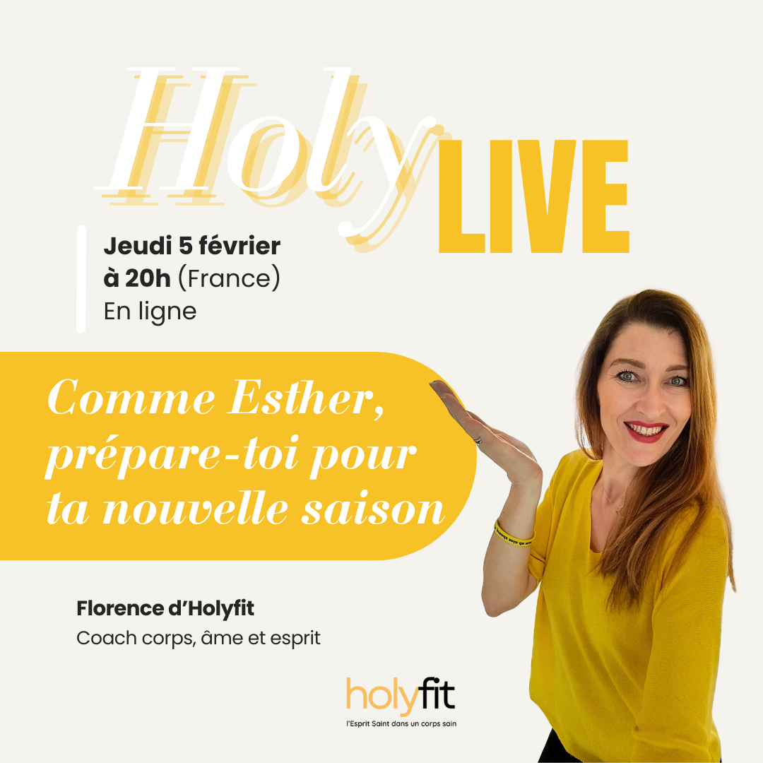 évènement: HOLYLIVE : Comme Esther, prépare-toi pour ta nouvelle saison Adresse : https://programme.holyfit.fr/holylive-esther SUR ZOOM EN LIGNE FRANCE Date : jeudi 5/02/2026 Heure : 20H (France) Type : Soirée Tarifs OFFERT Contact : Florence d'HOLYFIT // contact@holyfit.fr // https://programme.holyfit.fr/holylive-esther Détails supplémentaires : « HOLYLIVE : Comme Esther, prépare-toi pour ta nouvelle saison » 🗓 Mercredi 5 février à 20h (France) 🎥 En ligne sur Zoom 🌸 Avant chaque nouvelle saison, Dieu prépare. Esther n’est pas devenue reine par hasard. C'était en fait une mission divine pour sauver son peuple Mais avant la couronne,...