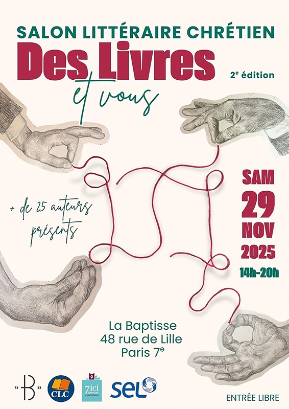 évènement: Salon Des livres et vous Adresse : 48 rue de lille Paris 75007 france Date : 29/11/2025 Heure : 14h-20h Type : Autre Tarifs entrée gratuite Contact : Librairie 7ici // contact@librairie-7ici.com // https://librairie-7ici.com/blog/post/742-2e-edition-salon-littaraire-chratien-des-livres-et-vous Détails supplémentaires : 29 auteurs chrétiens présents pendant une après-midi pour vous rencontrer. La deuxième édition du salon littéraire chrétien "Des Livres et Vous" approche à grands pas ! 📅 Rendez-vous le samedi 29 novembre 2025, de 14h à 20h, 📍 à La Baptisse – 48 rue de Lille, Paris 7e. Venez rencontrer plus de 30...