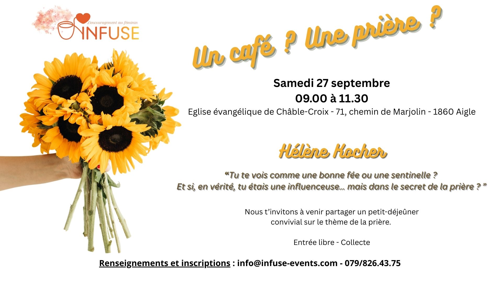 Thème : EN "VIE DE PLUS " Rencontre avec les associations Evénementielles et Infuse Lieu : Hotel Vatel. rue Marconi 71. 1920 Martigny Suisse Nos intervenantes !!! Marie Ray, Noémie, Johanna Exbrayat et Pauline pour la louange !!!! Retenez cette date dans votre agenda !!! Un événement à ne pas manquer que nous mettons en place avec une belle équipe de femmes incroyablement motivées. 💃🏻 Un événement qui veut rassembler les femmes afin de les fortifier et de les encourager dans leur foi. ✝ lien d'inscription pour la Suisse :...