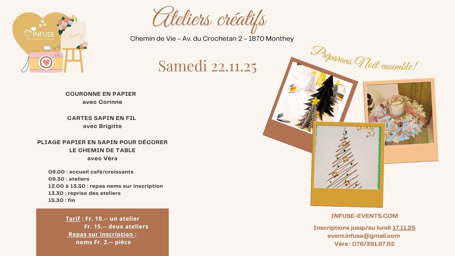 évènement: Infuse-Créatif : ateliers de Noël Adresse : 2, av. du Crochetan Monthey 1870 Suisse Date : 22.11.25 Heure : 09.00 à 15.30 Type : Journée Tarifs Fr. 10.-- un atelier - Fr. 15.-- deux ateliers Contact : Véra Pasche // vera.pasche@gmail.com // infuse-events.com Détails supplémentaires : Préparons Noël ensemble. Nous te proposons : atelier couronne en papier - sapins en pliage pour chemin de table - carte de Noël sapin en fil.