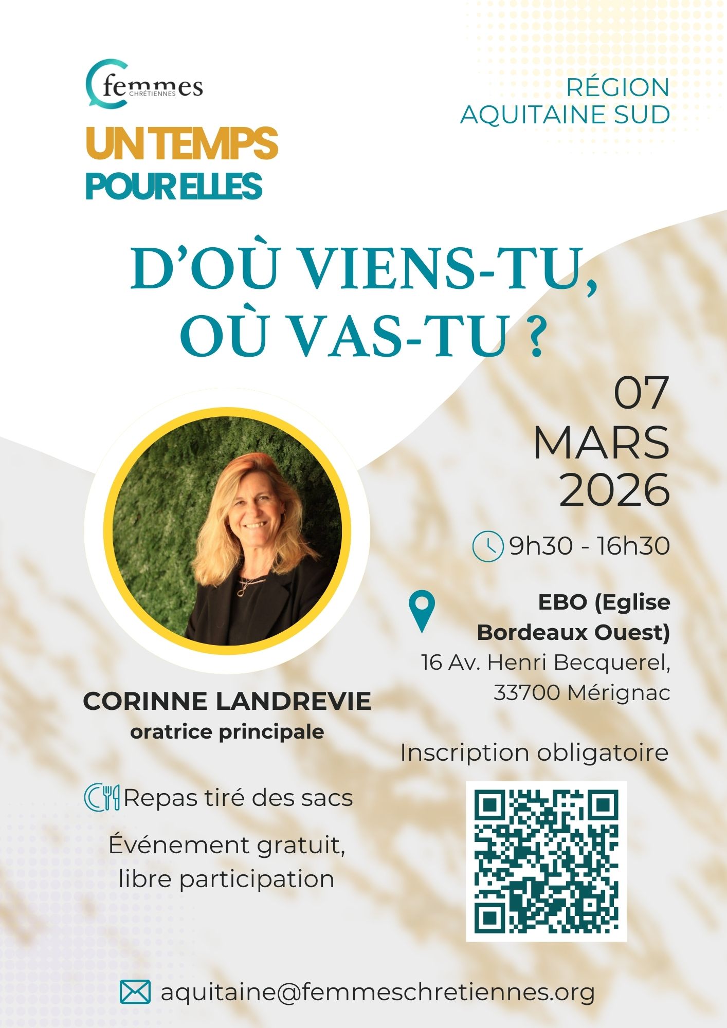Contact : MARIKA BOHUI // aquitaine@femmeschretiennes.org // https://www.femmeschretiennes.org/